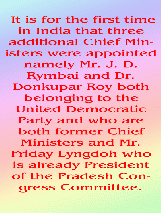 Almost all the ruling members besides the ministers have been gratified by posts of Parliamentary Secretaries, Chairmen, Co – Chairmen of various boards and corporations, irrespective of whether they actually qualify for these posts or have the competency to handle the posts. In order to satisfy the unending craving for more and more and financial sops, the public exchequer is forced to bear the brunt. It is for the first time in India that three additional Chief Ministers were appointed namely Mr. J. D. Rymbai and Dr. Donkupar Roy both belonging to the United Democratic Party and who are both former Chief Ministers and Mr. Friday Lyngdoh who is already President of the Pradesh Congress Committee. In addition to this, even former Union Minister Mr. P. R. Kyndiah has been allocated a job which holds the status of a Cabinet Minister. The question of a state having four Chief Ministers was raised by a member in Parliament as being unprecedented and the question was raised as to whether such a