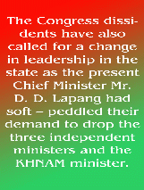The Congress dissidents have also called for a change in leadership in the state as the present Chief Minister Mr. D. D. Lapang had soft – peddled their demand to drop the three independent ministers and the KHNAM minister. This had earlier been done when Mr. J. D. Rymbai was hoisted to the post of Chief Minister but Mr. D. D. Lapang managed to make a comeback and regain the seat. As of now, Chief Minister D. D. Lapang still remains a common factor of the Congress led coalition with regional parties and any disturbance of the equation might ultimately lead to the downfall of the MUA government as the opposition NCP can not afford to just sit back in such a situation.