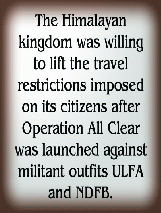 He also added that the Himalayan kingdom was willing to lift the travel restrictions imposed on its citizens, especially students and patients after Operation All Clear was launched against militant outfits ULFA and NDFB in 2003 to restore good relations with Assam. “We have to take risks now and withdraw the advisory,” said Mr. Wangda, adding that “The reason behind staying for a longer period of time is to assess the situation on the ground level so that relations can be improved substantially.”