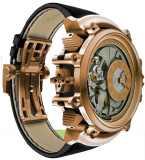 Bulgari’s Gerald Genta Magasonic costs a cool 4.1 crores, and, understandably, is one of a kind. Composed of 632 components and crafted by the Bulgari Manufacture De Haute Horlogerie in Le Sentier, the perlage and engraved wave pattern are handmade. It’s patented in an 18 carat pink gold case and has a skeletonised gold and sapphire dial, alligator strap and 18 carat pink gold folding buckle.