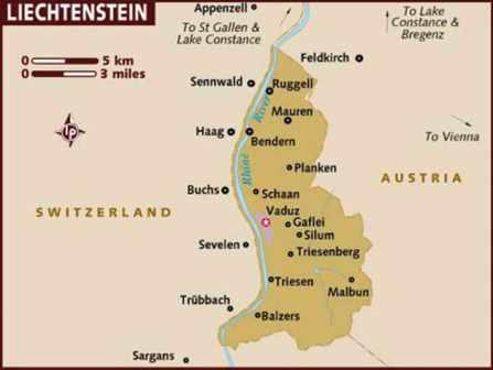 | The Principality of Liechtenstein is a doubly landlocked alpine country in Central Europe, bordered by Switzerland to the west and south and by Austria to the east. Its area is just over 160 km² (about 61.7 square miles), and it has an estimated population of 35,000. Its capital is Vaduz; the biggest town is Schaan. |