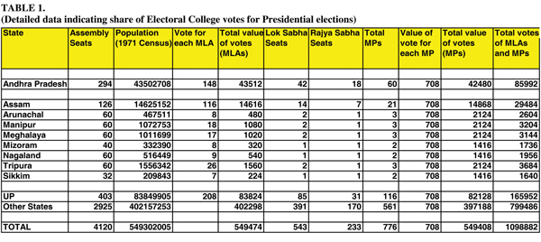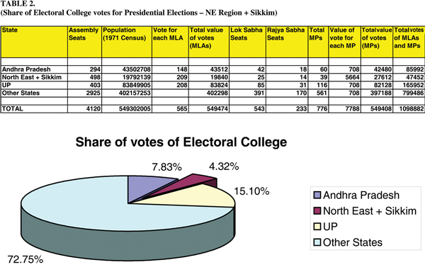 Generally, the number of votes given to a legislator is directly proportional to the population he or she represents. As a result, bigger states with bigger populations and larger number of seats in the state and Union Legislatures have a major say in the decision making process. Smaller states in the north east have no significant representation. In fact the entire north east including Sikkim has a share of only 4.32% of the total votes of the Electoral College.